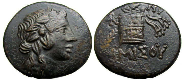 Rev: AMISOY; Thyrsos leaning against cista mystica draped with panther skin, monogram to left