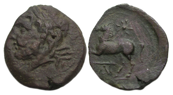 Rev: Horse prancing left; star above, AP(Pi)I monogram below