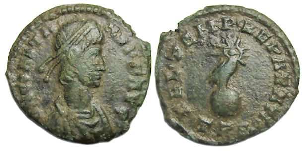 Rev: FEL TEMP REPARATIO; Radiate phoenix standing right on banded and dotted globe; TRS(dot) in exergue