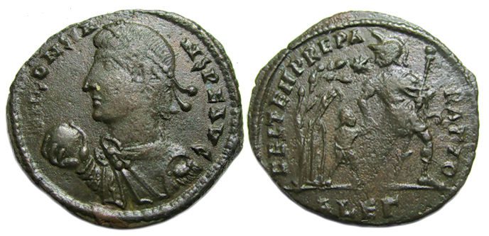 Rev: FEL TEMP REPARATIO; Soldier advancing right, head to left, holding inverted spear in his left hand and leading barbarian with his right from hut under tree