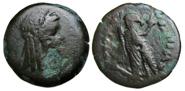 Obv: Head of Isis right, wearing wreath of grain ears, and her hair in long curls