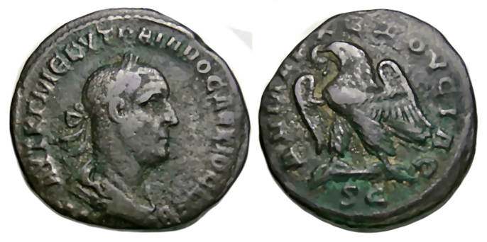Rev: ΔHMAPX ЄΞOYCIAC; Eagle standing left on palm frond with wings and wreath in beak, S C below